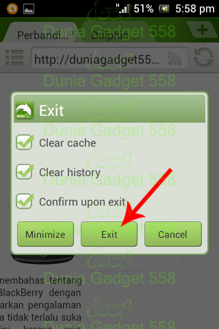 Ingatlah untuk selalu menggunakan menu exit jika ingin mengakhiri aplikasi, agar smartphone anda terhindar dari masalah yang menyebabkan smartphone menjadi hang atau cepat panas. Untuk dapat menikmati aplikasi browser ini, silahkan download di Play Store